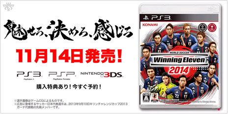 14年4月17日(木) 『ワールドサッカー ウイイレ 14 蒼き侍の挑戦』の早期購入特典が決定! ps3版はゲーム内ユニフォーム、3ds版は本田選手の下敷き;3ds『ワールドサッカー ウイニングイレブン 14』の体験版が2月19日より配信開始――バルセロナやインテルなど強豪チームを収録 13年11月28日(木) 『ワールドサッカー ウイニングイレブン 14』のクラウドゲーム版が配信スター 14年ならではのスペシャルなウイイレ、『ワールド ├ウイイレ14 (PSP版) └ウイイレ14 (3DS版) Facebook;